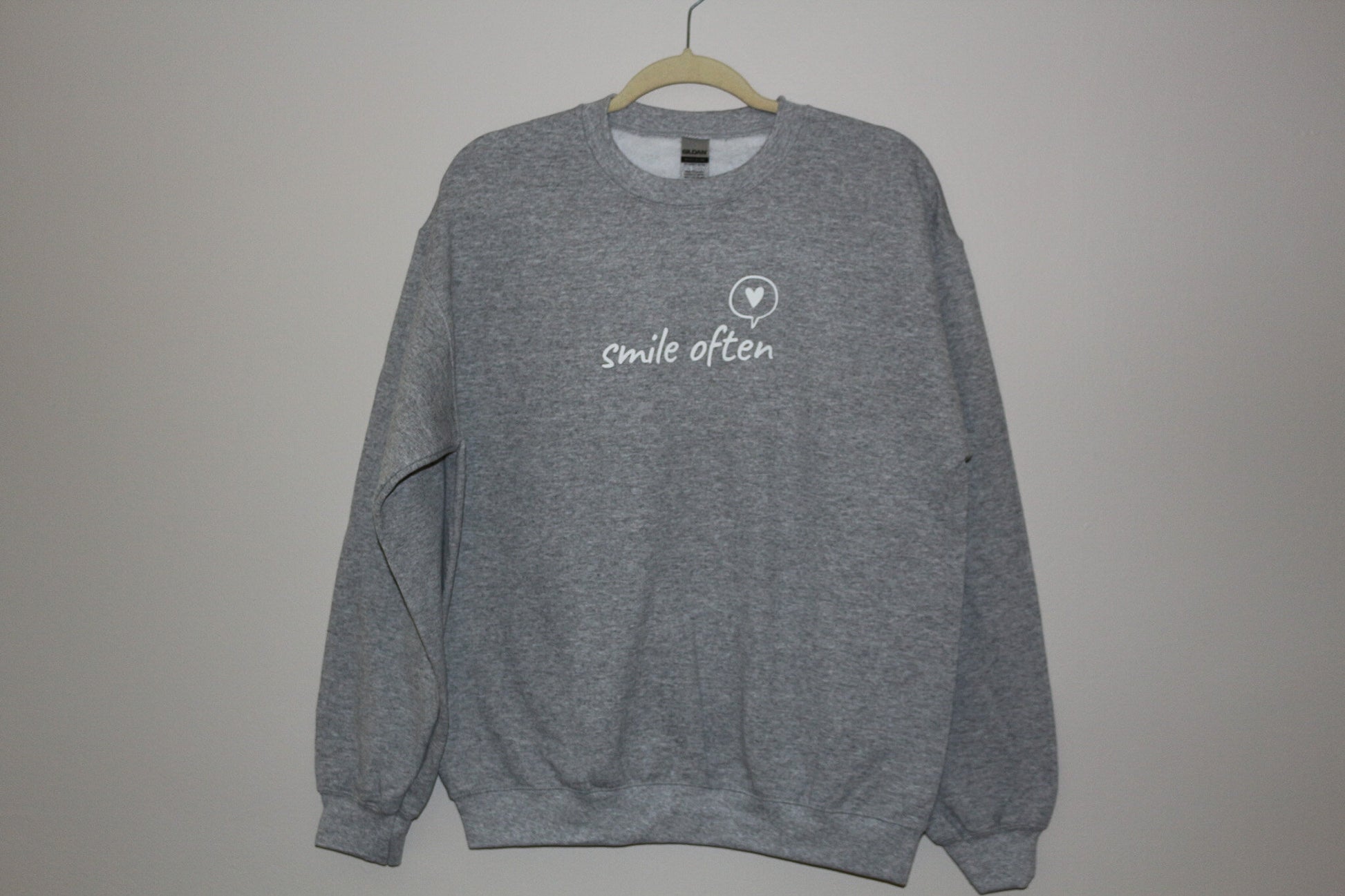 Grey soft Smile Often crewneck, white writing, simplistic design!